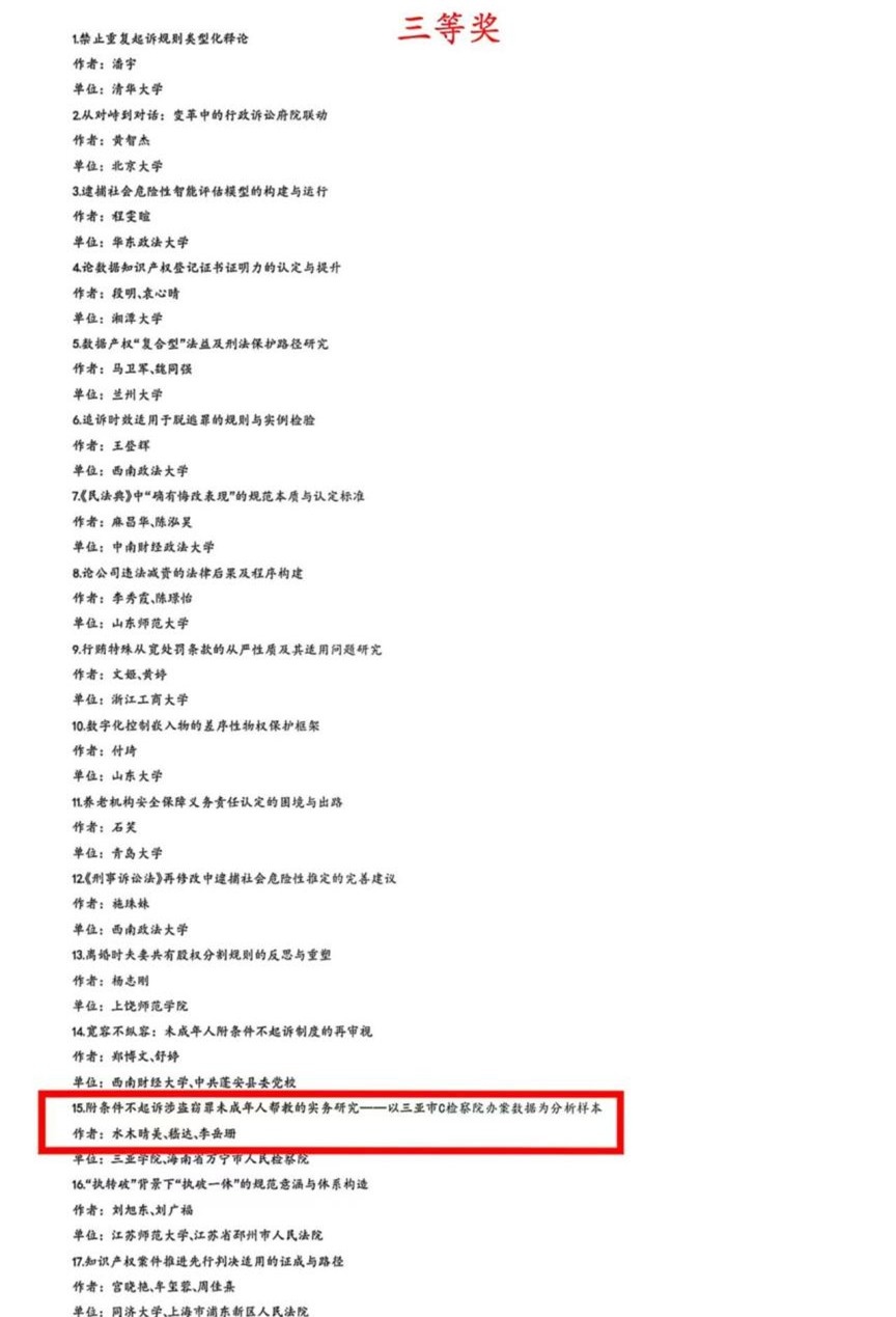 据悉,本届论坛共收到有效参评论文3561篇,其中法院系统内投稿占75%,系统外占25%,作者涵盖高校、科研机构及检察机关等多领域。最高院组织50余位资深法官与法学专家,经匿名初审、复评、终评及意识形态与原创性检测,最终评选出获奖论文480篇(一等奖20篇、二等奖90篇、三等奖170篇、优秀奖200篇),总体获奖率13.5%,三等以上获奖率仅为7.86%。在这强手如林的学术竞技场上,我校汽车学院青年教师嵇达与法学院水木晴美副教授、万宁市人民检察院李岳珊检察官助理合作撰写的《附条件不起诉涉盗窃罪未成年人帮教的实务研究——以三亚市C检察院办案数据为分析样本》脱颖而出,荣获三等奖!