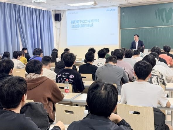 行业深耕者马志乐总经理的成长历程与实践经验,结合先进的电池回收技术解析及流水线生产实景展示,全面呈现了这一行业的发展现状与广阔前景。马志乐总经理的从业之路,是电池回收行业发展的生动缩影。从行业萌芽期的探索前行到如今的规模化发展,他凭借对绿色产业的坚定信念,在技术研发、渠道搭建、行业规范等方面积累了丰富经验。他见证了电池回收从过去到标准化、集约化的转型,也亲历了技术突破带来的行业变革,其成长轨迹折射出从业者们在政策支持与市场需求双重驱动下的不懈追求。现场氛围热烈,同学们通过此次分享,深入了解了这一绿色产业的现状、前景及技术细节。